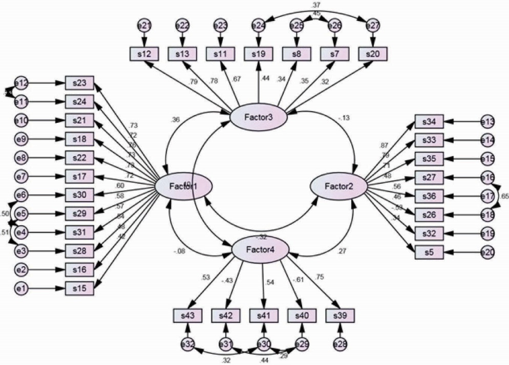 The results of the CFA analysis indicated that the model fit was established reasonably by the indices (χ2/df = 2.03 < 5; SRMR = 0.061 < 0.1, RMSEA = 0.049 < 0.08 and 90% CI: 0.045 to 0.054, CFI = 0.91 > 0.90, NFI = 0.91 > 0.90, NNFI = 0.91 > 0.91, GFI = 0.90 > 0.91, AGFI = 0.91 > 0.90), after some modifications in the model based on modification indices.20,24,25 Moreover, the relationships between parameters and factors were also evaluated based on this model. The factor loading values indicated that the items had significant loadings on the four factor solution, with the standardized factor loadings ranging from 0.32 to 0.84. This indicated that all items represented moderate to strong factor loadings26 (Figure 1).
