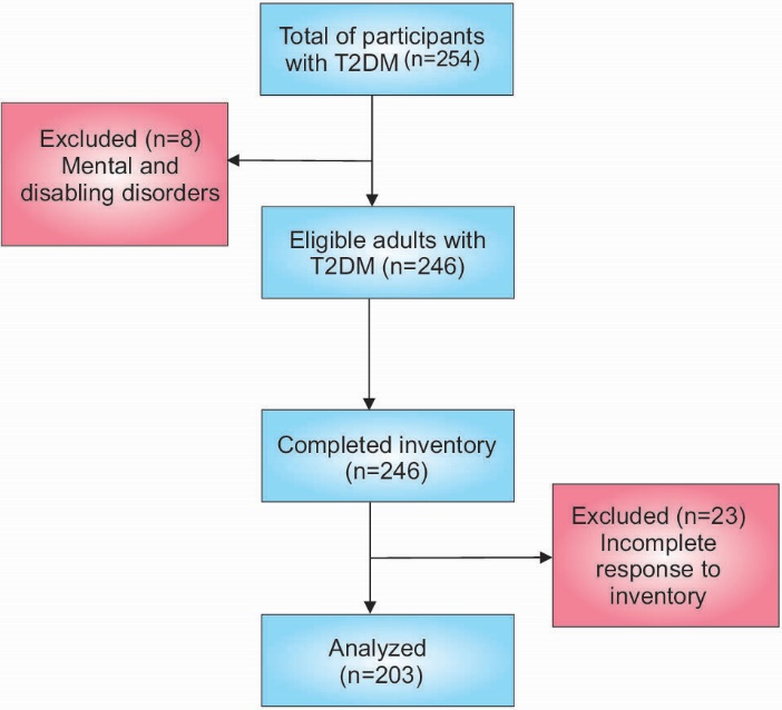 Methods: In 2015, this cross-sectional study was carried out on 203 participants recruited by convenience sampling in Isfahan, Iran. Content and face validity was confirmed by a panel of experts. The comments noted by 9 outpatients on the inventory were also investigated. Then,the items were administered to 203 T2DM patients. Construct validity was conducted using exploratory and structural equation modeling confirmatory factor analyses. Reliability was also assessed with Cronbach alpha and inter-class correlation coefficient (ICC).