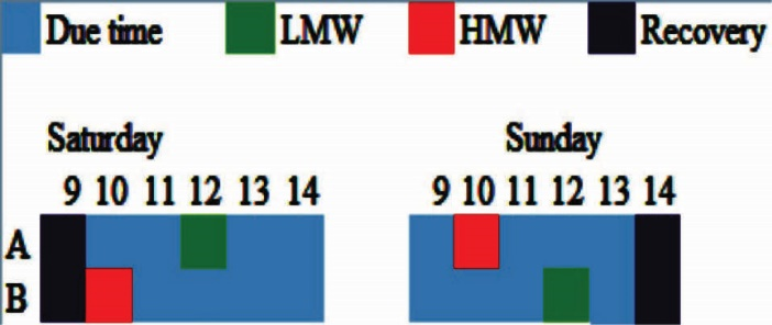 To evaluate MW, we selected operators of the cement, city traffic, and power plant control centers. All operators almost permanently monitored and controlled their system functions or equipments such as temperature, pressure, fuel consumption, ampere changes, traffic density and so on from morning to the end of their shift, and if an accident or special event occurs, they try to reestablish the normal condition of their system. Each operator uses monitors on his desk and monitors continuously vital parameters of the system during his work shift. We interviewed the operators and supervisors in order to characterize their real working conditions. It was recognized that they experienced two different conditions: first, situations in which the mental work is low and, second, situations in which the mental work is high. Based on their statements, LMW and HMW occur during each shift work. Based on this information, measurements related to systems condition were conducted between 9:00 am and 14:00 pm. For example (Figure 1), on Saturday for operator A, ECG and EEG signals were recorded in rest and LMW blocks and for operator B, ECG and EEG signals were recorded in rest and HMW blocks. The next day (Sunday) for operator A, ECG and EEG signals were recorded in HMW and recovery blocks and for operator B, ECG and EEG signals were recorded in LMW and recovery blocks. It is necessary to mention that the NASA-TLX questionnaire was completed immediately by each operator after LMW (or HMW) block. Also, there were no accident and no severe work condition change that evoke rapid MW change during the experiment. The experimenter specified the day with LMW and HMW conditions for each operator, in which the following steps were performed, respectively:
