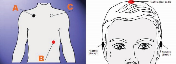 Figure 2. Electrode positions for ECG (left) and EEG (right). Reprinted with permission from Mind Media BV, The Netherlands.