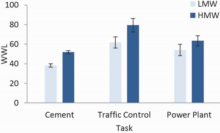 The results of the subjective ratings of workload measured by NASA–TLX across LMW and HMW conditions for all operators have been summarized in Table 1. Weighted workload (WWL) in LMW and HMW conditions were 52.1 and 63.4, respectively. Based on the operators’ subjective responses, in LMW condition OP and in HMW condition MD had dominant importance and in LMW and HMW conditions PD had the lowest importance. The results of two way ANOVA indicated significant differences for means of the NASA-TLX and its dimensions between LMW and HMW conditions, except for OP (Table 1). Based on the operators’ subjective responses, WWL score was significantly higher in traffic control task than in other tasks (Figure 3). Changes in NASA-TLX subscales across LMW and HMW conditions among tasks have been illustrated in Figure 4. From the operators’ perspective, the degree of difficulty varied based on each task for LMW and HMW conditions. The results showed that, based on operators’ point of view, MD, TD, OP, and EF subscales in traffic control task and PD, FR subscales in power plant task had dominant importance and MD, PD, TD, OP, and EF in cement control center task and FR in traffic control task had the lowest importance. Also, in two conditions, based on operators’ point of view, overall means for PD had the lowest score for all tasks. In the traffic control task for LMW condition OP, EF, and MD and in the HMW condition MD, EF and TD had dominant importance, respectively. A repeated measures ANOVA revealed that increasing MW had a significant effect on the operators’ subjective responses in LMW compared to HMWF ([1,53] = 216.303, P < 0.001, ε η2 = 0.803). Task-MW interaction effect on operators’ subjective responses was significant (F [3, 53] = 12.628, P < 0.001, η2 = 0.417). A bonferroni post hoc test showed that there was a significant differences for operators’ subjective responses in all tasks (P < 0.001).