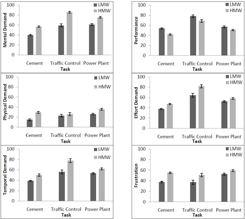 Using NASA-TLX, all operators stated that the task demands of the HMW condition were higher than those of the LMW condition. In the LMW condition, OP was the highest, and in the HMW condition, MD was the highest. This means that the operators tried to maintain their performance at the highest level in the LMW condition, and when task demands increased, MD increased as well. The high the average mental requirement, the more the operator felt that his task was demanding. The findings showed that cement control center operators experience low to moderate MW in two conditions and in this situation probable of mental disorders will be decreased. Furthermore, in the LMW condition power plant operators experienced high MD compared to traffic control and cement operators. In the HMW condition, the traffic control operators experienced high MD compared to the power plant and cement operators. It seems that when MW increased, the operators working at traffic control center experienced more mental stress, which could lead to mental disorders under these circumstances. It was observed that the demand for physical effort was indeed very small for all control center operators. Because of good OP in the LMW condition, the operators had low levels of FR, and in this way they may have experienced lower mental stress. However, during the HMW condition, especially in the traffic control and power plant control centers, MD and the level of FR increased with an increase in task demands, which may have caused operators to experience more stress while performing their tasks.