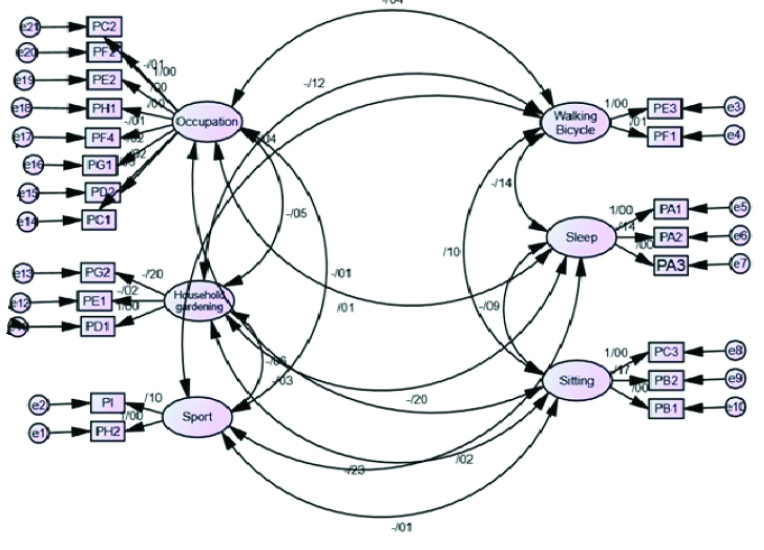 The findings of the present study suggested that the questionnaire might have a four factors structure for the instrument, including recreational leisure time, sedentary leisure time, household/gardening work, and occupation work. The results showed that the factor loadings of the items PG3 and PF3 were less than 0.2. As, the considered cut-off value to retain an item in the scale was 0.2, these items were not included in the final model. Also, the CFA provided evidence to support the factor structure represented by these items. Therefore, the questionnaire assessed PA in four factors (domains) and four sub-factors with 21 items. A concern in the analysis of this instrument was its construct validity which had not been investigated previously. So, the identified model should be further assessed. However, the preliminary factor structure found in the present study was not different from those found in the original domains. Previously, some validation studies on the questionnaire have been conducted in Denmark and Iran, but the demographics and geographic contexts of the studies were different.13,14