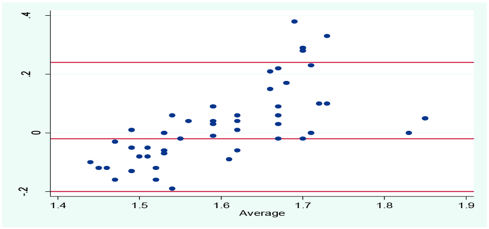 Spearman’s correlation coefficient between the scores (MET-time) of the self-report PA questionnaire and the IPAQ showed positive and moderate-to-good correlations (r = 0.62) between the factors, which was statistically significant (P < 0.001). Also, the Bland-Altman plot indicated moderate agreement between the two instruments (Figure 1). In the Bland-Altman plot, the mean difference was -0.02 with wide 95% limits of agreement (-0.2 to 0.25), but four out of 50 values (8%) were outside the 95% limits of agreement.