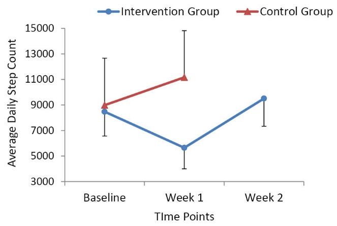 Figure 1. Intervention group vs. control group average daily step counts over time.