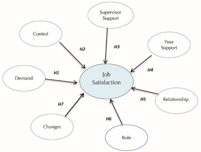 In our study, job satisfaction was directly associated to demand, control, relationships, role, and changes and was reversely associated to relationships. Interventional efforts are suggested to increase job satisfaction among nurses through improving the workplace situation and reducing workload with the hope to improve job demand, decisions making, applying therapeutic methods, improving relationships skills, and minimizing role conflict among nurses.