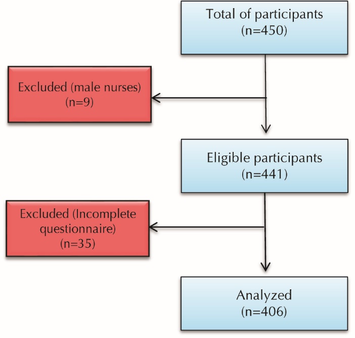 In our study, there were 55 items in the questionnaire; 35 items for job stress and 20 items for job satisfaction. Thus, 450 nurses were enrolled in the study. Due to the low number of male nurses in the sample (9), we chose to exclude them from analysis. Also, the information of 36 nurses was excluded from data analysis due to incomplete questionnaires. Finally, the data on 406 respondents were analyzed (Figure 2). The respondents were randomly selected based on the table of random numbers. The nurses with at least a bachelor’s degree in nursing, a full-time job, no second job, no specific physical and mental problems (based on self-report) and at least one year of work experience in the current employment were included in the study. The exclusion criteria included not willing to participate in the study and not complete the whole questionnaire.