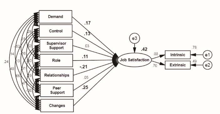 In SEM, we found significant relationships between job satisfaction with demand, control, role, and changes. Moreover, there was a negative significant relationship between job satisfaction and relationships. Marcatto et al also reported significant relations between job satisfaction with demand, control, supervisor’ support, relationships, and role.22 The model fit in their study was 0.42. The participants included in the study of Marcatto and colleagues22 were the staff of legal offices, local police, the education sector, social services, the cultural sports section and marketers who were different from the participants of our study. Therefore, the difference in the nature of jobs may be the cause of some differences in the results of the studies.