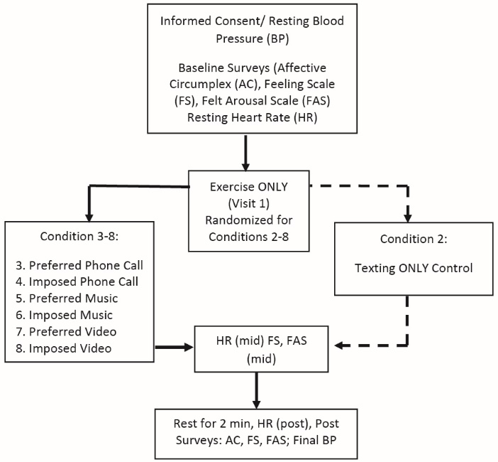 There were 8 counterbalanced, experimental conditions, which included (1) Exercise Only, (2) Texting Only, (3) Preferred Phone Call, (4) Imposed Phone Call, (5) Preferred Music Playlist, (6) Imposed Music Playlist, (7) Preferred Video and (8) Imposed Video. Details of these experimental conditions are described in the narrative that follows. As stated above, the experimental conditions occurred in a randomized order. However, for all participants, the first visit to the laboratory was the Exercise Only (Condition 1) condition. During this visit, participants completed a 10-minute bout of walking on the treadmill at a self-selected pace (described below). For each of the subsequent visits, they walked on the treadmill for 10 minutes at the pace they self-selected during Condition 1; thus, walking speed was identical for all experimental conditions. The conditions (e.g., texting only, phone call, music, video, etc.) for Visit 2 through Visit 8 occurred in a randomized order across the participants.