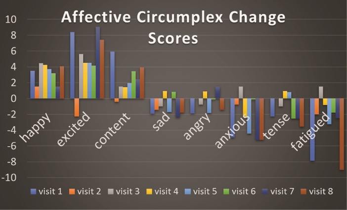 Figure 2. Mean affective circumplex change scores across the 8 visits. Each individual change score represents the post-exercise minus pre-exercise affect change score for each distinct affect parameter across each respective visit. With regard to the significant pre-post change scores for the individual visits, statistical significance was observed for happy (visit 4: P = 0.05; visit 5: P = 0.02; visit 8: P = 0.03), excited (visit 1: P = 0.001; visit 7: P = 0.01; visit 8 P = 0.03), sad (visit 5: P = 0.05), anxious (visit 1: P=0.05; visit 7: P = 0.01), and fatigued (visit 1: P = 0.03; visit 8: P = 0.002). Condition description: visit 1-Exercise Only; visit 2-Texting Only; visit 3-Preferred Call; visit 4- Imposed Call; visit 5-Preferred Music; visit 6-Imposed Music; visit 7-Preferred Video; visit 8-Imposed Video.