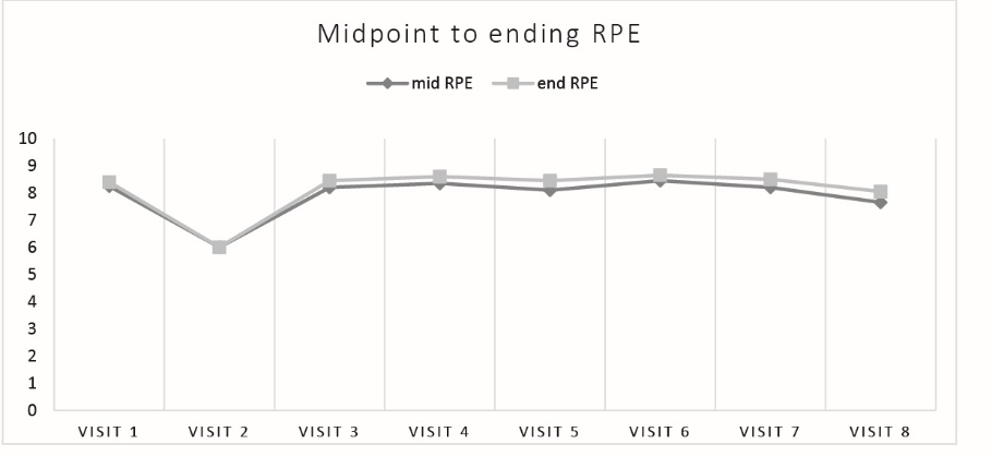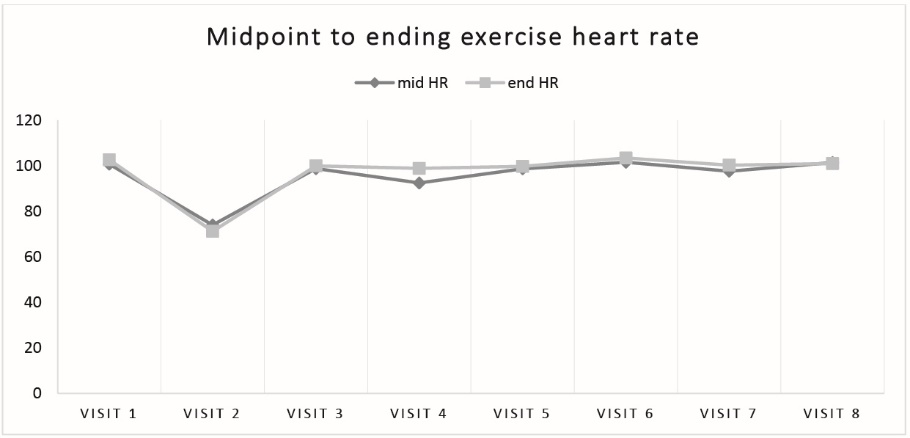 Figure 3. Values for heart rate were recorded during exercise across the 8 visits. Each individual data point represents the mean recorded heart rate for the midpoint of the treadmill walk (dark gray line) and endpoint of the treadmill walk (light gray line). Condition description: visit 1-Exercise Only; visit 2-Texting Only; visit 3-Preferred Call; visit 4- Imposed Call; visit 5-Preferred Music; visit 6-Imposed Music; visit 7-Preferred Video; visit 8-Imposed Video.
