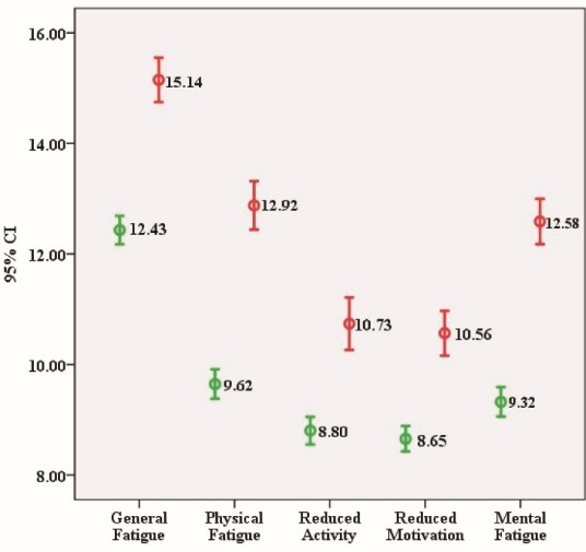 Note: red bars indicate the scores of MFI dimensions for those nurses with a higher level of psychological distress (above the cut-off point) and green bars indicate the scores of MFI dimensions for those nurses with a lower level of psychological distress (below the cut-off point). The general, physical and mental fatigue dimensions were significantly different between two groups.