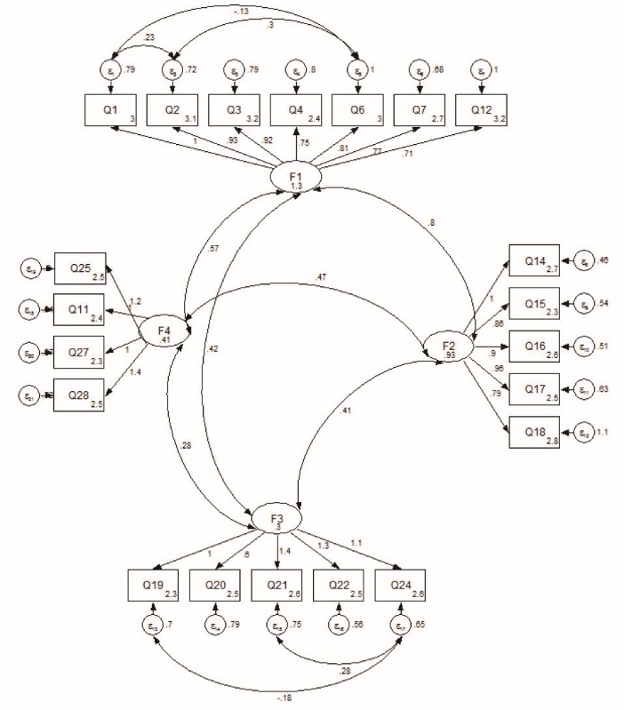 The modified CFA output illustrated in Figure 1 showed that the solution was appropriate. The following values of absolute fit indices showed an acceptable level of fit: (1) the chi-square test with χ2 value of 360.8, df = 178, P = 0.416, indicated a smaller difference between expected and observed covariance matrices; (2) CFI = 0.914, RMSEA = 0.070 (90% CI: 0.060-0.081) indicated acceptable level of fit.