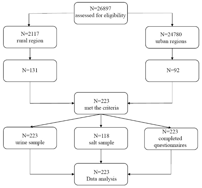 Students were selected through multi-stage random sampling in Shariar region, Tehran province of Iran, in 2016. There are 318 schools in Shahriar region (254 in urban regions with 24780 students, and 64 schools in rural regions with 2117 students). In this study, 12 schools were randomly selected from both rural and urban regions. Overall, 223 female students were randomly selected from among 26897 students studying in the randomized 12 schools (Figure 1). Apparently healthy female students aged 14-19 years, who lived in rural and urban parts of Shahriar, studying in all types of schools were included in this study. Those who suffered from thyroid or renal diseases, had a history of treatment with thyroid hormones, took supplements containing iodine during the preceding 6 months, or were not willing to participate in the study, were excluded.