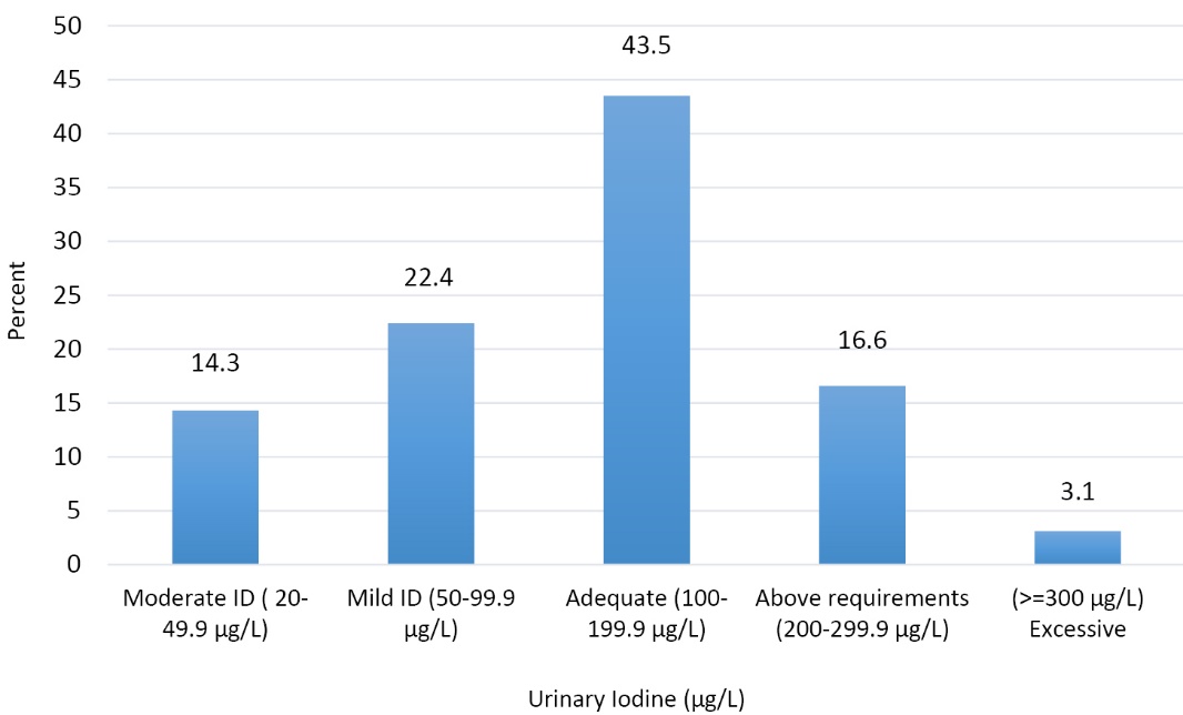 Results: Median and Mean (95% CI) concentrations of urinary iodine and creatinine were 129 µg/L, 137.62 µg/L (95% CI: 126.28, 148.95) and 1.72 g/L, 1.86 g/L (95% CI: 0.55-3.17),respectively. The frequency of mild, moderate and severe ID were 22.4%, 14.3% and 0%,respectively; 43.5% had adequate, and 3.1% had excessive urinary iodine levels. Mean saltiodine concentration was 21.69 (SD=10.56) ppm. Mean knowledge score was 12.7 (SD=3.44).About half of the students had a poor (25.1%) or fair (24.2%) knowledge about iodine deficiency.Adjusting for the confounders, no significant positive association was found between knowledge about iodine-rich food sources and goitrogens with urinary iodine excretion.