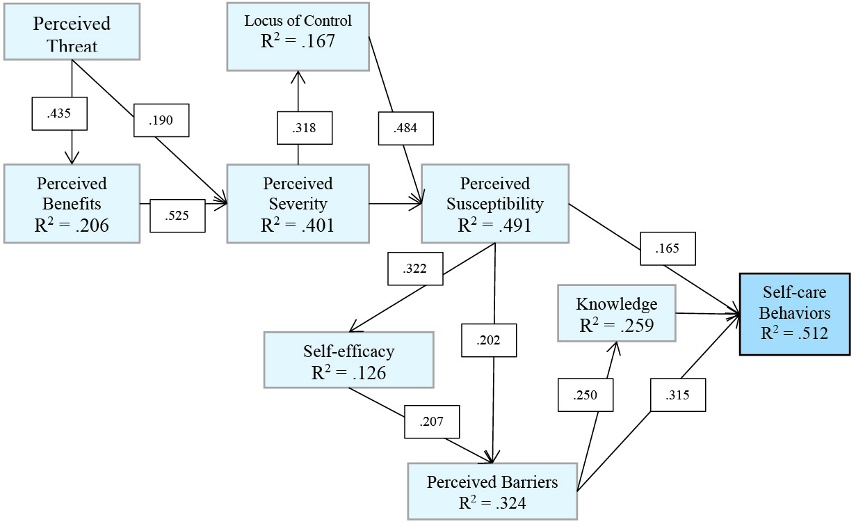 Table 3 illustrates the direct, indirect and total effects of independent predictors on self-care behaviors. This table shows the positive direct effects of knowledge (r = 0.422), perceived barriers (r = 0.420) and perceived susceptibility (r = 0.208) on self-care behaviors. The other independent variables had indirect effects on self-care behaviors.