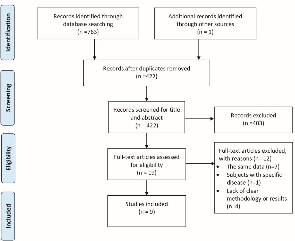 The search yielded a total 763 articles: 562 from the English databases and 201 from the Persian databases. After assessing title and abstract, 403 studies were excluded due to meeting the predefined exclusion criteria. Then, full-text of the remaining 19 articles was retrieved for more detailed evaluation. The manual search found 1 additional article. Finally, 9 papers were included in the study. Figure 1 shows the results of search strategy according to the PRISMA (Preferred reporting items for systematic review and meta-analysis) flow diagram.11