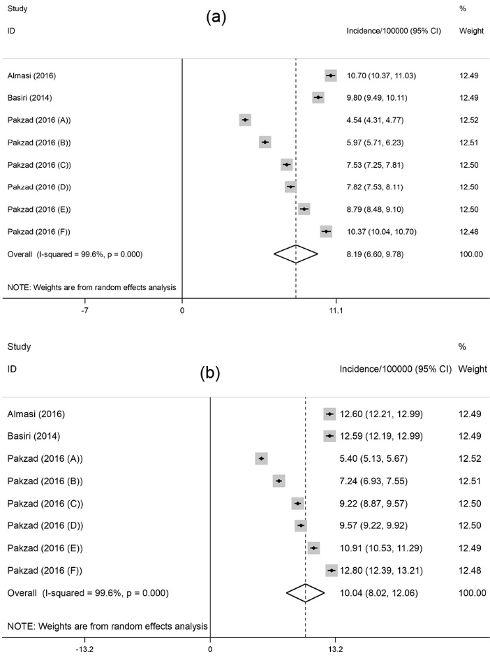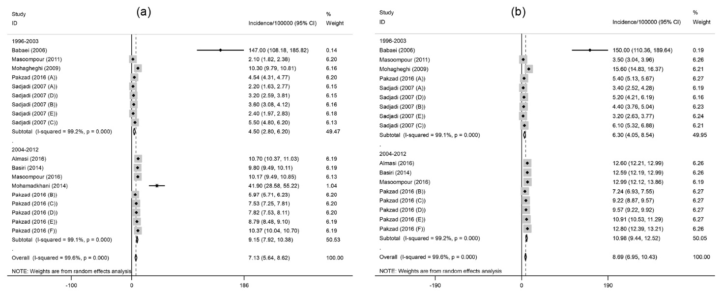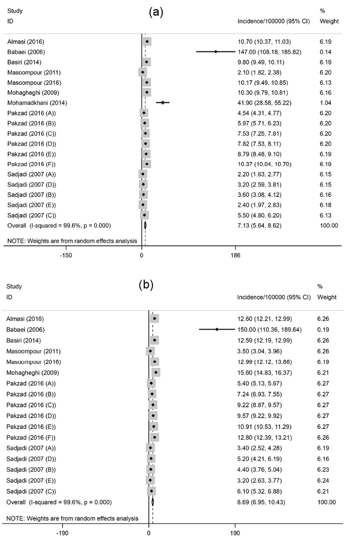 Figure 2. (a) Forest plot of the pooled crude incidence of prostate cancer in Iran. (b) Forest plot of the pooled age-standardized incidence of prostate cancer in Iran.