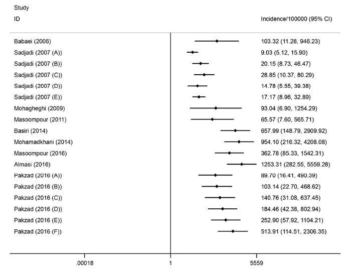 Two authors (MZ and EM) independently assessed the study eligibility by reviewing the titles and abstracts of all potential citations. Discrepancies were resolved by consensus between the reviewers. Full-text of the relevant articles was assessed. The following data were extracted from each included study: first author’s name, location of study, study period, population size, diagnostic method, and crude rate and/or age-standardized rate (ASR) of the incidence. If multiple publications of the same population were retrieved, the one giving more detail was chosen.