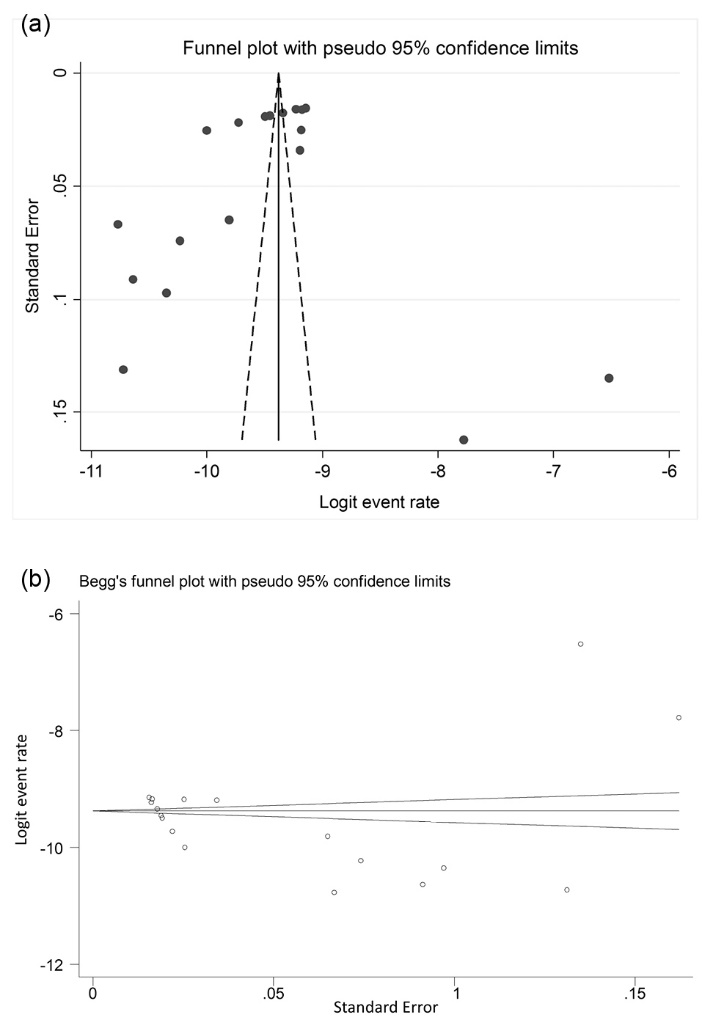 Figure 6. (a) Funnel plot to assess publication bias across the studies. (b) The Begg’s test for publication bias.