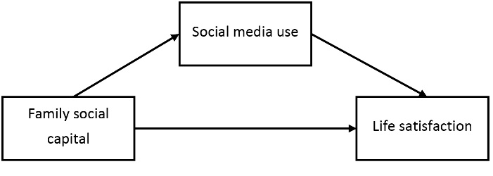 Figure 1. Hypothesized model of association between family social capital, social media use, and life satisfaction in adolescents.