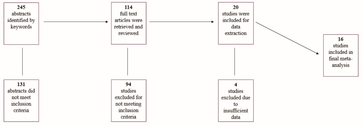 Figure 1 displays the results of the systematic review procedures. A total of 245 studies were first identified by keywords. After a complete review of all abstracts, the full-text of 114 articles were retrieved. After review of all full-text articles, 20 studies met inclusion criteria with 16 meeting all final criteria. Table 1 describe these studies in terms of their characteristics.45-60 A total of 77 effect sizes were computed from all studies with specific HRQOL measures ranging from 6 (ERF and PRF) to 12 (PF) effect sizes. Table 2 contains results from the PEDro methodological quality analysis. Of the 16 studies included in the analyses, the mean PEDro score of 4.9 (SD = 1.0).