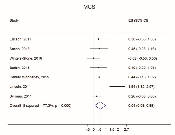For this meta-analysis research, it was assumed that different populations indeed exist within the older adult population (e.g., diseased and non-diseased) and therefore RT would have varying effect on HRQOL across these different populations. With this assumption in mind, random effects models were pre-planned and performed on all meta-analyses.35 To describe individual study-level effect sizes and each pooled effect size, Forest plots were constructed with 95% confidence intervals (CIs).36 To further describe variability in effect sizes, the Q statistic for heterogeneity, tau-squared (τ2) representing the variance component, and I2 describing percent of heterogeneity were computed.37 Additionally, moderator analyses using random effects models were performed for four categorical factors and three continuous factors.35