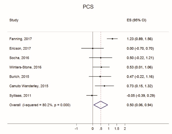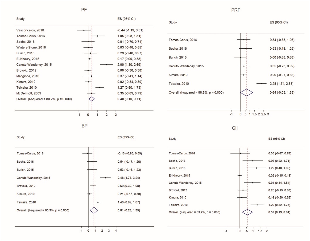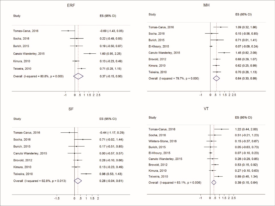 Results: A total of 16 studies were included in the analyses with a mean Physiotherapy Evidence Database (PEDro) score of 4.9 (SD=1.0). Among the mental health measures, RT had the greatest effect on mental health (Effect size [ES]=0.64, 95% CI: 0.30-0.99, I2=79.7). Among the physical health measures, RT had the largest effect on body pain (ES=0.81, 95% CI: 0.26-1.35, I2=85.9).Initially, RT did not significantly affect measures of emotional role function, social function or physical role function. However, after removing a single study, RT significantly increased all HRQOL measures.