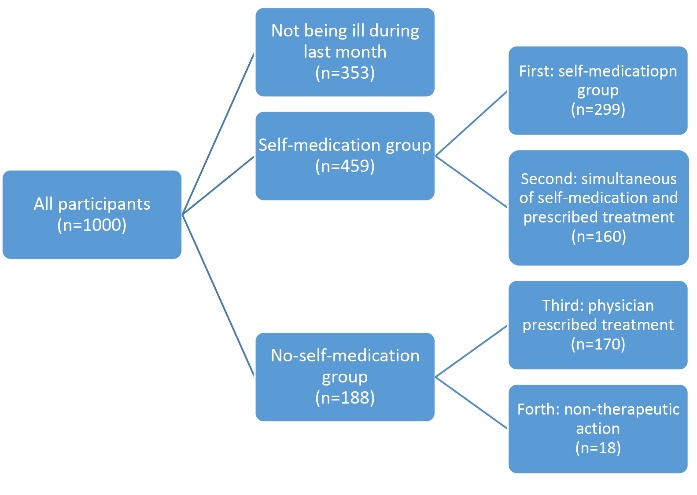 A total of 647 (64.7%) participants (among 1000 recruits) suffered from a disease or illness within a month prior to our visit. We placed these participants in four groups, as follows: the first self-medication group (n=299); the second simultaneous physician’s prescribed treatment and self-medication group (n=160); the third physician’s prescribed treatment group (n=170); and the forth non-therapeutic action group (n=18). By combining the first (self-medication) and the second (simultaneous physician’s prescribed treatment and self-medication) groups, a summation “self-medication” group, was formed, which consisted of 459 participants. 459 participants had either self-medication alone or in combination with a physician’s prescribed treatment. By combining the third (physician’s prescribed treatment) and the fourth (non-therapeutic action) groups, a summation “no-self-medication” group, was formed, which consisted of 188 participants who did not act out self-medication at all. Of the total recruits, 353 had not been ill during the past month, therefore, they were not included in either “self-medication” or “no-self-medication” groups. The composition of the participants in the study is shown in Figure 1. All the comparisons were done between “self-medication” group and “no-self-medication” group.