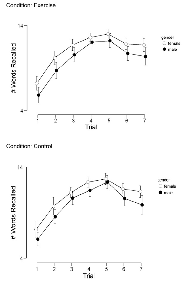 In conclusion, our experiment provides evidence that young adult females outperform males in verbal memory function. We did not observe sufficient evidence that sex moderates the effects of exercise on verbal memory performance, including short-term memory, learning, or long-term memory. Despite these findings, it is of critical importance to promote regular participation in physical activity, among all age populations, as habitual physical activity can help reduce a multitude of cardiovascular and cognitive morbidities.