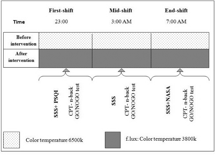 The study was a field trial intervention in design, with duration of 4 weeks, and was conducted in two stages from September 23, 2017 through November 21, 2017. All the participants were almost similar in terms of the intensity of environment light exposure and staff responsibilities. Furthermore, their shift-work schedule consisted of 2 night shifts, 3 day shifts, and 2 days off, with each shift lasting for 8 hours. Participants were excluded from the study if their work schedule was not mentioned above. Since the study aimed at investigating the influence of f.lux software during night shifts, all the assessments were performed only during these shifts. In addition, in order to eliminate the adaptation effect to doing several night shifts in a row, both assessments were carried out during the second consecutive night shift. The baseline assessments were carried out under the existing computer screen light conditions in the week preceding the installation of f.lux software. The same measurements were repeated again 4 weeks after installing the software. The software installation took place over the weekend, before night shifts; assessments were conducted three times with 4-hour intervals (at the beginning, in the middle, at the end) during the shift (Figure 1). At each stage, the working memory, alertness, vigilance and attention was evaluated. And at the end, shift NASA-TLX was evaluated. The day before the study, the participant’s became familiar with the assessment tools.
