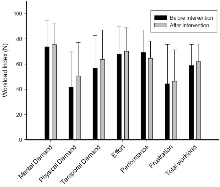 Workload comparison between pre-intervention and post-intervention stages.