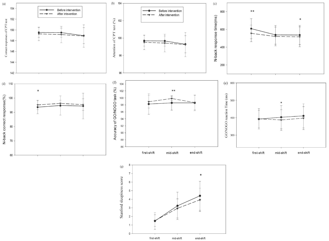 Effects of filtering short wavelengths from computer screen light during night shifts on cognitive performance, subjective and objective measures of alertness. The data points are the means and standard errors for : (a)response time in CPT(ms); (b)percentage of attention in CPT test; (c) n-back response time; (d) correct response percentage of the n-back test; (e) GO/NOGO reaction time; (f)percentage of response accuracy in GO/NOGO task and (g) Stanford sleepiness score, under baseline (black filled circles) and intervention (black filled triangles) conditions over three time points of Computer use at night shift. The aster (* P < 0.01 and **P < 0.001) denotes a significant difference between the baseline and intervention condition (f.lux installation).