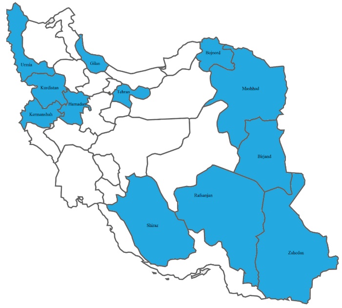 We took a sample of around 500 from big universities with more than 10 000 students, and a sample of around 250 from small ones with less than 10 000 students as follows: Kermanshah (492), Tehran (500), Shiraz (483), Mashhad (508), Hamadan (265), Kurdistan (247), Urmia (255), Gilan (251), Iran (250), Zahedan (251), Birjand (266), Bojnord (245), and Rafsanjan (248) (Figure 1). At each university, the samples were taken from both genders in different colleges and from various disciplines.