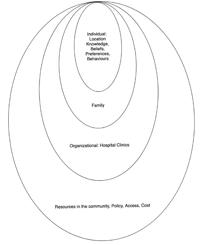 Data collection took place over a period of six months in 2015. Two major methods-non-participant observation and in-depth interviews were triangulated to obtain more reliable information from participants. Observation of patients and HPs took place over a period of 8 weeks, lasting over 1400 hours using an observation checklist and field note-taking, which were later expanded to provide more descriptive accounts of the events observed. The data gathered focused on the counselling process, including patients’ time of arrival at the out-patient’s department, waiting times, the nature of care provided and prevailing atmosphere. This technique was found valuable because it provided the opportunity to understand the variety of information given to patients regarding diet, how dietary education took place in terms of presentation, language and models; and patients’ reactions to this.22 In-depth semi-structured interviews were also conducted with HPs and patients based on a topic guide using the socio-ecological model (SEM),23 which holds that certain behaviors of individuals might be shaped by their cultural beliefs, knowledge, preferences, the context of diabetes clinic, access to social support and cost (Figure 1). Some examples of questions for HPs were: “What type of dietary and physical activity advice do you offer?”, “How well do know patients adhere to T2D advice?”, What do you think are some of the barriers/challenges to diabetes self-care?”, What do you think are some of the things that make self-care easy?”. Interview questions for patients included: “When it comes to what to eat, do you experience any challenges?”, “Is it difficult to follow the advice given by the HP sometimes? Interviews, which lasted between 45-55 minutes were conducted in a quite location of the hospital provided by the HPs. It provided participants with an environment to speak freely and openly about their experiences. A flexible approach to interviewing was adopted using follow-up questions, probes and comments to gain greater insight into participants’ views about diabetes self-care.24 Data saturation (i.e. where no new perspectives on the subject were being elicited) was achieved after conducting 33 interviews and this was confirmed with the last three study participants. Informed consent was obtained from all participants.