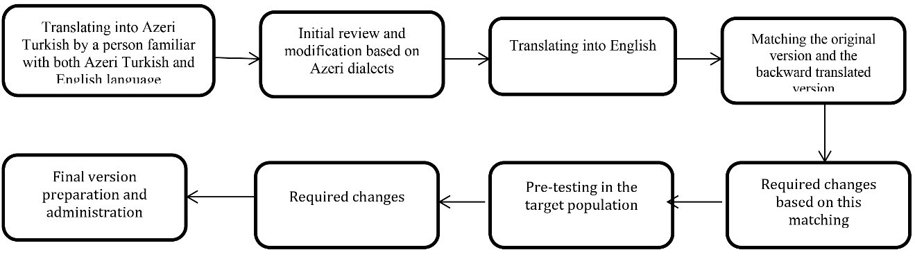 At this stage, the original English version of the 15-item GDS was translated into Azeri Turkish in accordance with the translation protocol of the International Quality of Life Assessment (IQOLA) project.19 For this purpose, a translator whose native language was Azeri Turkish and was experienced enough in translating English texts translated the English version of the questionnaire into Turkish. The translator was also asked to provide a list of possible alternative translations for some of the words, phrases, and sentences of the questionnaire, if necessary. The prepared Turkish version was presented to a person professional with Turkish and English to be back-translated into the original English language. Then, the back-translated and the original versions were presented to two professional English interlocutors in order for them to determine the extent to which the two questionnaires matched based on a checklist. Subsequently, the poorly matching questions were back-translated and the final version was prepared after the required amendments. The Turkish version of the questionnaire was also presented to ten people professional with the Azeri Turkish language in order for them to modify the items based on the colloquial language. The scale was also completed by ten older adults as a pilot test, and their comments were used in preparation of the final version. Two specialists with a master’s degree in clinical psychology and work experience of five years were selected and trained on how the scale should be completed. Finally, the questionnaire was read aloud to them. Then, they were asked to read it to ensure they would not have any difficulty in conveying the items to the selected sample.