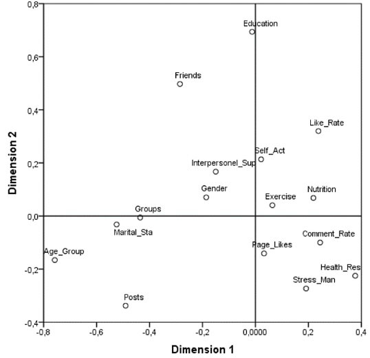 Results: In this study, a two-dimensional solution with an actual fit measure equal to 0.958was found, and this solution can be interpreted as about 48% of the explained variance. This two-dimensional result shows the relationships and differences between healthy lifestyle subdimensions, social media usage and some demographic characteristics.