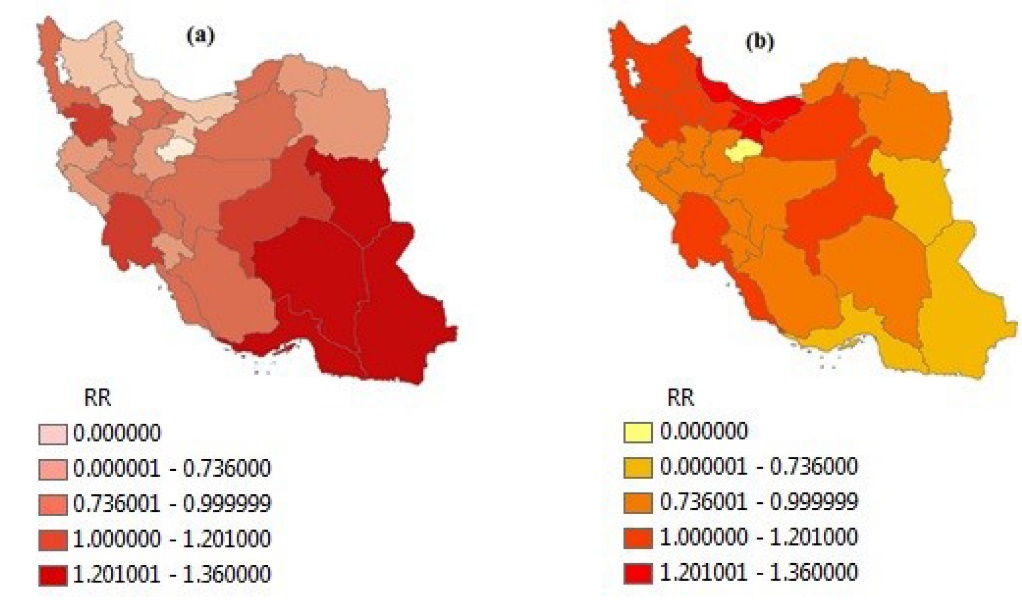 Using traditional methods based on the raw or standardized data was been very common in the last decade. One of the most common methods used by many researchers to estimate the RR of disease is standardized mortality ratio (SMR) method. Although, it has several disadvantages. Firstly, the mean and variance of SMR are dependent upon expected numbers. And secondly, in regions where there are not any cases of disease, the SMR is zero. Today, the use of disease mapping methods has led to controlling the problem of SMR and creating the high-precision maps.26 On the other hand, previous studies in Iran only have focused on a small area. While awareness of disease trend can help to allocate the resources equitably.