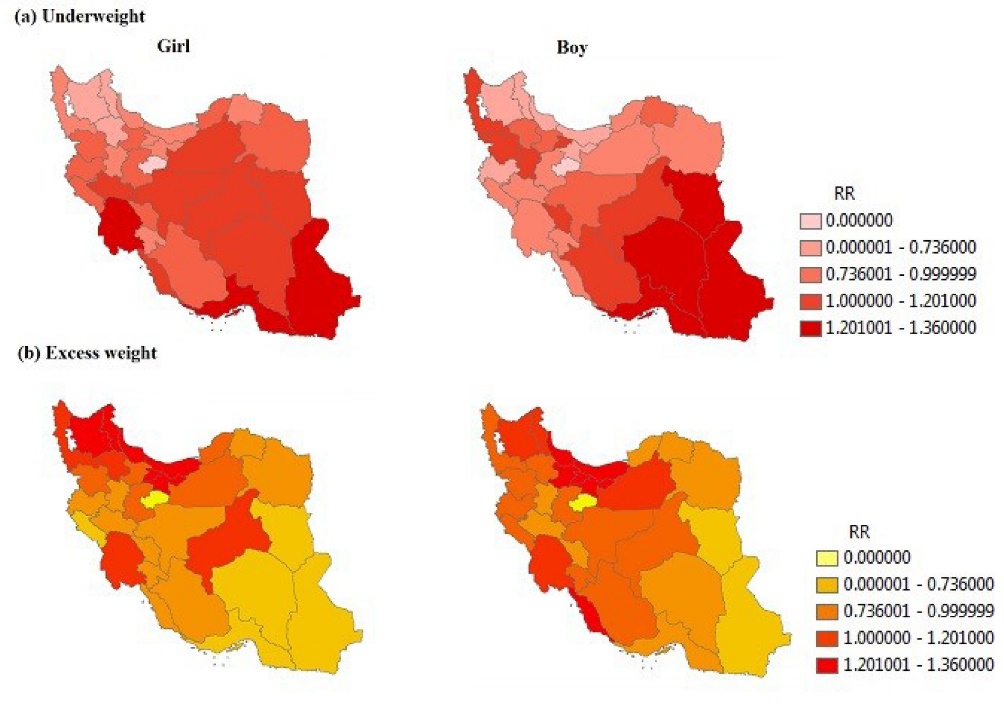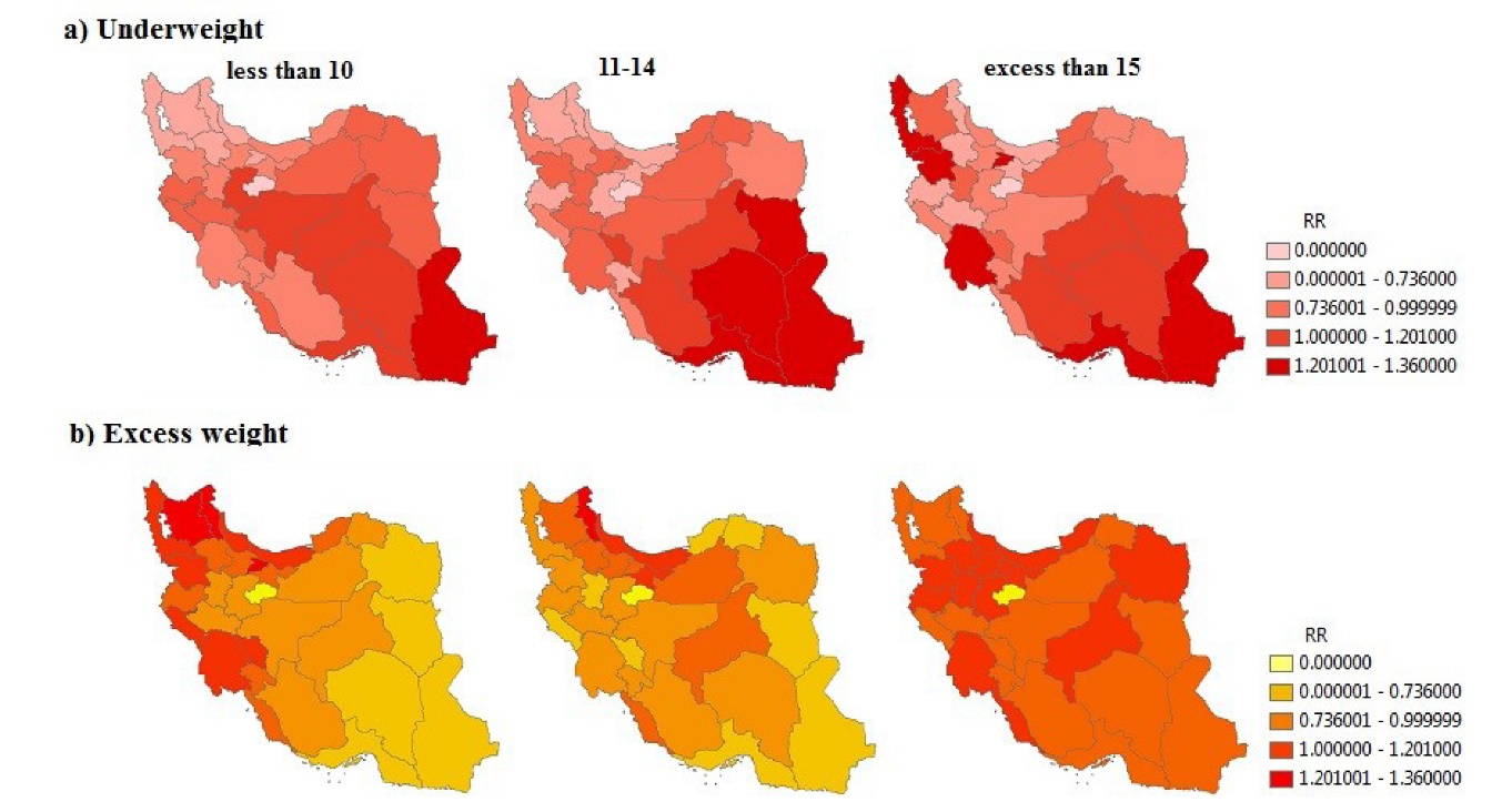 Results: The highest RR of underweight was found in southeastern provinces. Whereas, the highest RR of excess weight was documented in northern, northwestern and capital provinces.Sistan-Balouchestan (RR=1.973; Bayesian confidence interval [BCI]: 1.682, 2.289), Hormozgan(RR=1.482; BCI: 1.239, 1.749), South Khorasan (RR=1.422; BCI: 1.18, 1.687) and Kerman(RR=1.413; BCI: 1.18, 1.669) had the highest RR of underweight. Mazandaran (RR=1.366; BCI:1.172,1.581), Gilan (RR=1.346; BCI: 1.15,1.562), Tehran (RR=1.271; BCI: 1.086,1.472) and Alborz (RR=1.268; BCI: 1.079,1.475) provinces are high risk regions for excess weight.