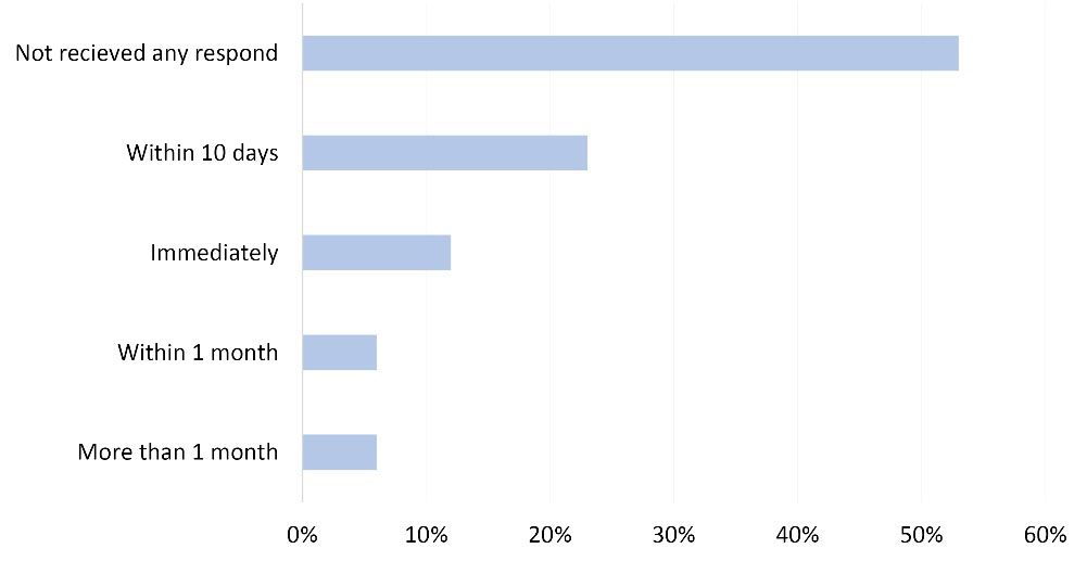 After the reporting of suspected cases to the health facility at district level, half of the FCHVs have not received any message back from them, as shown in Figure 2.