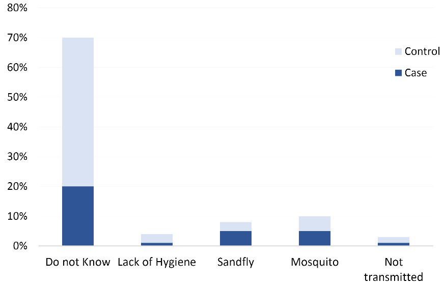 Regarding the knowledge of the VL transmission route, more people in houses with a former VL patient were aware of the transmission route of the disease (“via insects called sandfly/housefly”, which “lives inside bedroom”), but more than 50% of all interviewees knew it is transmitted by a “mosquito”. However, 40% confounded VL with another disease, such as TB and said that respiration, food and bed sharing transmitted VL; 14.3% thought that it was a non-communicable disease (Figure 5).