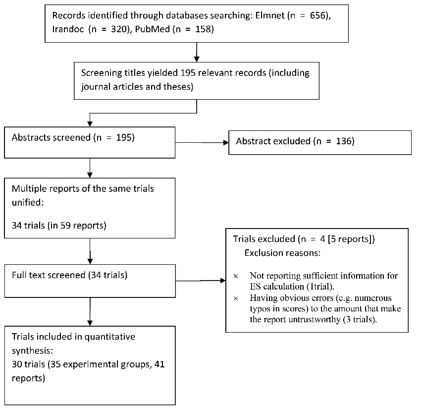 For each analysis, we checked for potential outliers (based on studentized residuals) and influential cases (based on an index analogous to cook’s distance in meta-analytic context34). We did not conduct any analysis to detect publication bias. Because fail safe-N has several problems and is not recommended to be used. Also, using funnel plot and the related tests are appropriate only if there were considerable differences between trials in terms of their sample size, and at least some of them have large samples which raise their publication chance, even if their results are not statistically significant. This logical basis was not true in the context of our study (for more details on these methods, see Jin et al35). Subgroup analyses were conducted based on three pre-specified factors: treatment type, researcher’s education (Ph.D. or M.A.), and pain type.