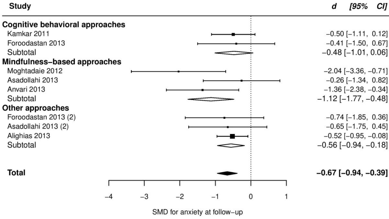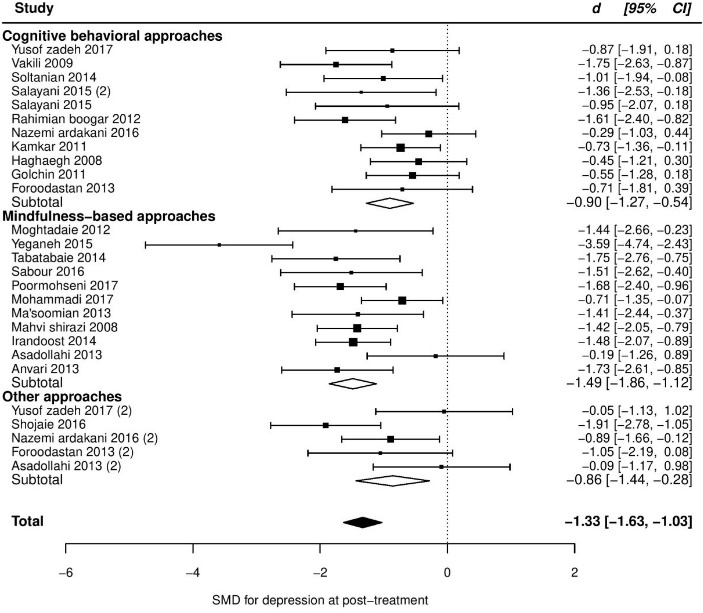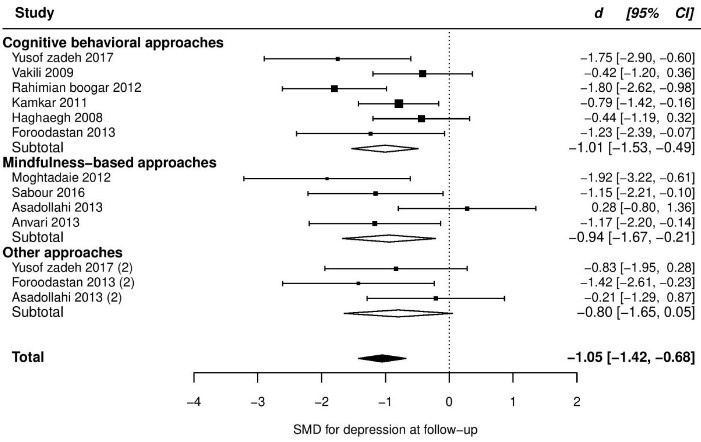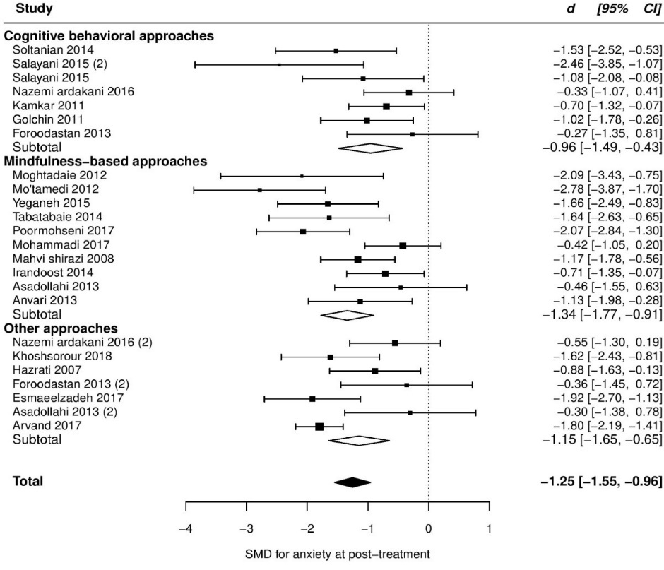 Our objective in this study was to evaluate and synthesize Iranian randomized clinical trials that investigated the efficacy of psychological interventions on anxiety and depression in adults with CP compared to usual care or waitlist. Then, we compared our results with other meta-analytical results, and tried to stress the differences between them, not only concerning the effect sizes (ESs) but also other aspects of trials, such as methodology.