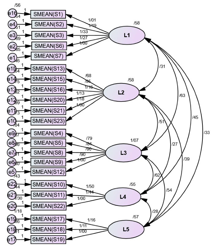 The confirmatory factor analysis (CFA) model was developed based on the data collected from 563 students. CFA with maximum likelihood was performed in Amos 24 (IBM® SPSS® Amos™ 24) to examine the 5-factor structure of the scale, and goodness of fit indices including root mean square error approximation (RMSEA), goodness of fit index (GFI), normed fit index (NFI), relative fit index (RFI), and incremental fit index (IFI).