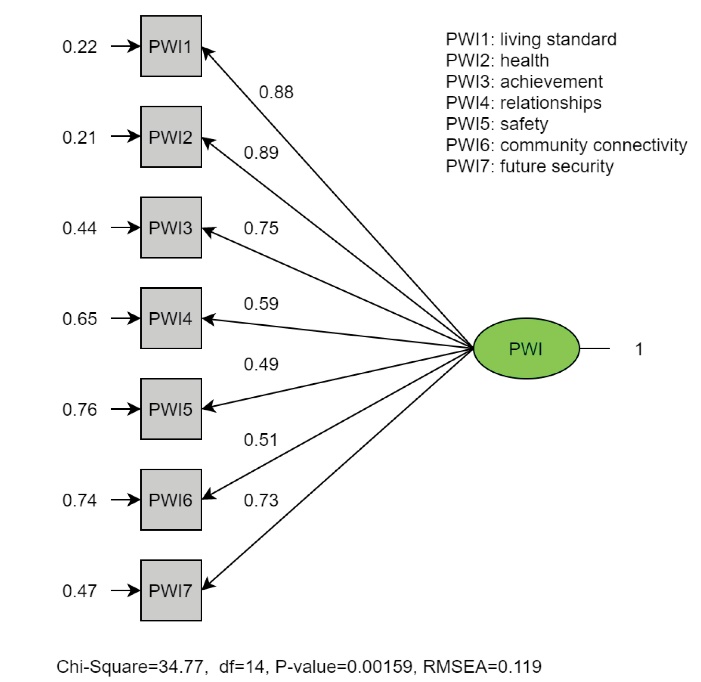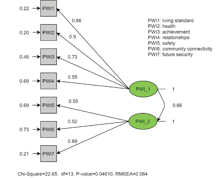 Figures 1 and 2 show the entire standardized factor loading for the two models (single-factor model versus two-factor model). With regard to the second model, the loading of PWI5 and PWI6 items had slightly improved, while the last item (PWI7) had dramatically increased from 0.73 to 0.89. Moreover, the error term of PWI7 had dramatically decreased from 0.47 to 0.21. The highly correlated error in the two-factor model may be the result of similar expressions used in the instrument.