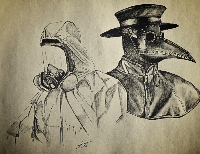 Another important issue is the safety of healthcare providers that should be highly taken into consideration. Precautions to be implemented by healthcare workers who care for patients with COVID-19 include an appropriate use of personal protective equipment (PPE); this involves selecting the proper PPE and being trained about the correct ways to equipment, removal, and disposal of it (Figure 1).6 One of the most iconic PPEs in medicine was used by plague doctors. Their costume consisted of a long overcoat and a beak-shaped mask, regularly filled with aromatic substances, along with a broad-brimmed hat, boots, gloves, and an outer covering clothing (Figure 1). As nowadays the approach to patients with plague has totally been changed and there is no need for such costumes, it is expected that the management situation of COVID-19 patients will also change by a better understanding of the pathogenesis and the structure of the virus; this change may also include some alternations in PPE especially in the masks. The self-protection for health care workers is so important that they can become a potential patient themselves and an involuntary coronavirus spreader while being a caregiver who treats the patients. In spite of the current emphasis on the use of PPE to control the virus transmission, the compliance of healthcare workers is still as not as expected.7 The reasons behind this fact may be as the followings: low level of support from the managers or lack of access to equipment, cultural problems, lack of training, not trusting the quality of available PPE, and not having enough desire to deliver a good patient care.